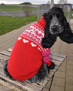 Knitted DROPS dog’s jumper for valentine with hearts in ”Karisma”