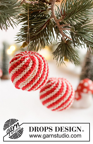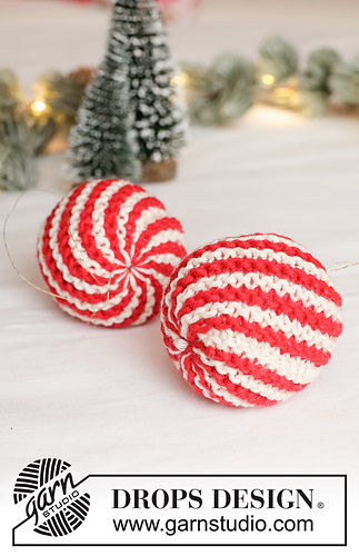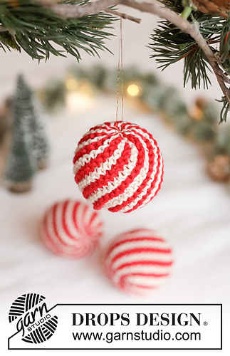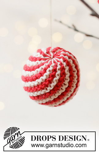 Knitted Christmas bauble in DROPS Cotton Merino. The piece is worked back and forth in garter stitch and stripes/spiral. Theme: Christmas.