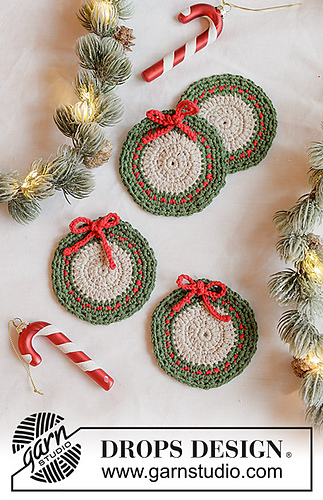 Crocheted coaster/wreath in DROPS Cotton Light. The piece is worked in the round from the middle outwards. Theme: Christmas.