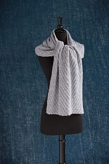 Looking for a project that’s a bit more interesting than straight stockinette? Hatta’s generously sized wrap is an excellent candidate. The four-stitch knit-and-purl pattern changes direction at the center point, creating a series of wide V’s that run the length of the piece. Valley Yarns’ Peru—baby alpaca, wool and nylon chainette—is slightly heathered, soft to the touch, yet warm and sturdy.