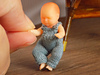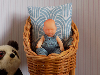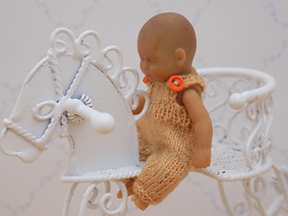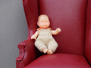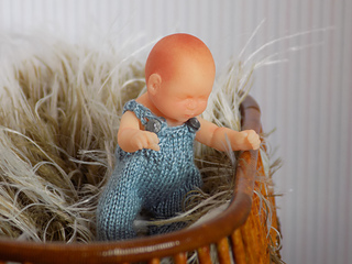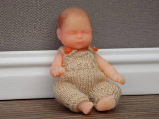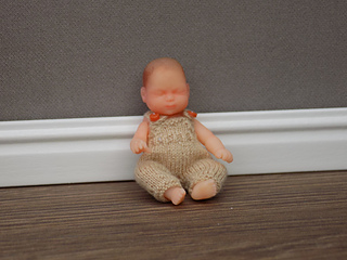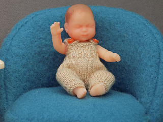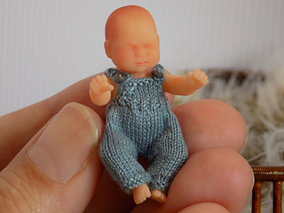 A pattern to knit a miniature pair of dungarees with 2 tiny 3mm buttons. The dungarees can be removed.