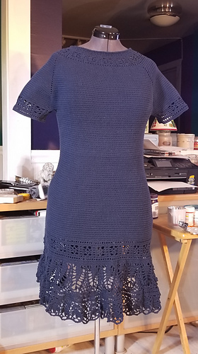 Crocheted dress with raglan, lace pattern and short sleeves, worked top down. Sizes S - XXXL. The piece is worked in DROPS Safran.