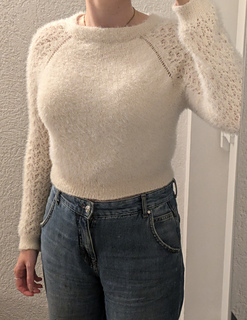 Knitted jumper in DROPS Alpaca and DROPS Kid-Silk. The piece is worked top down with double neck, raglan, lace pattern and ¾-length sleeves. Sizes S - XXXL.