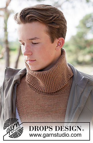 Knitted neck warmer for men in DROPS Daisy or DROPS Karisma. Piece is knitted bottom up with stocking stitch and rib.