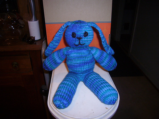 Lola Bunny is a stuffed bunny about 13 inches (33 cm) tall, knitted in the round on double pointed needles (magic loop can be substituted).