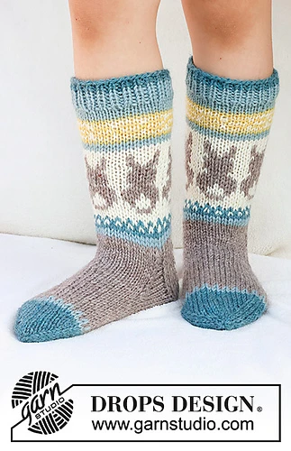 Knitted socks for children in DROPS Karisma. The piece is worked top down in stocking stitch, with multi-coloured pattern and Easter bunny. Sizes 24 - 43. Theme: Easter.