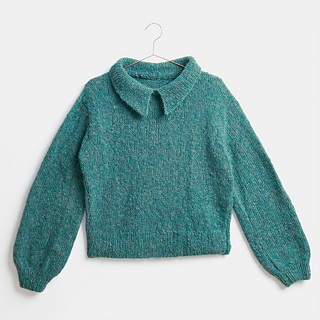 Dieser kurze Pullover wird flach in Einzeltei9len vom Bund aufwärts gestrickt. Die Form ist eine umgekehrte A-Form mit überschnittenen Schultern. Der Halsausschnitt erhält eine doppelte Blende aus der für den Kragen aus der Brauchkante Maschen aufgenommen und dann der Kragen in Rippen gearbeitet wird.