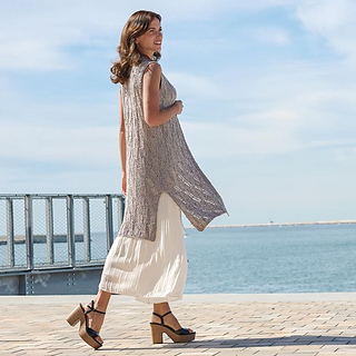 This knitted vest is worked in an original lace pattern and looks perfect over dresses, high-waisted wide-leg trousers, skirts, or denim shorts. Concept Universo adds fine sparkle and day-long softness. Treat yourself to a creative pause and build your style, stitch by stitch.