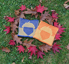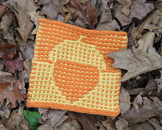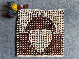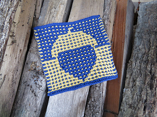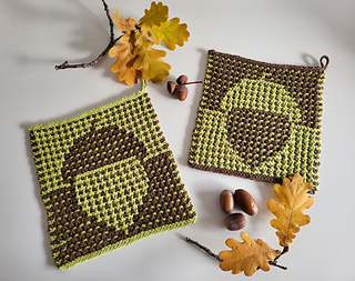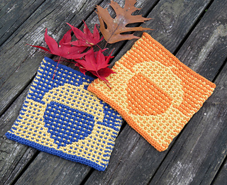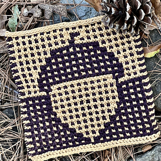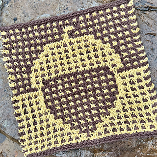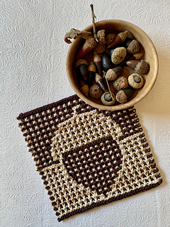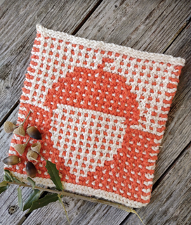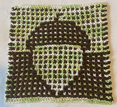 Plant this acorn at the sink for a thousand dishes. Drop them on your friends and family, too. This cleaning cloth is knit using mosaic garter stitch. Just one strand of color works every two rows while the other strand rests at the edge. Gauge and dimensions are provided with a Worsted-weight cotton yarn. Choose colors that contrast well. Try your camera’s “black & white” setting to look at your yarns in grayscale and check the contrast between your selection(s). Both positive and negative charts are included in the pattern.