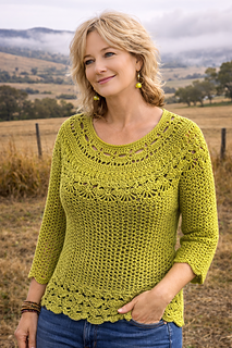 This top - down circular yoke garment can be made in lot of yarn weights using a J(6mm) hook. It can be made in pure linen which makes it perfect for summer layering, but swap that out to lace weight mohair and your winter glamour is assured. The intricate pattern in the yoke is repetitive and addictive, and the body of the garment is a simple V stitch which is TV watching crochet.