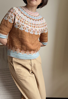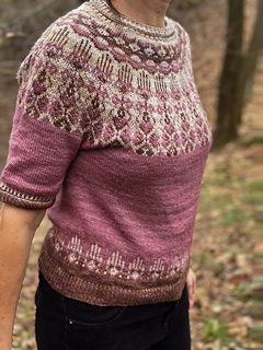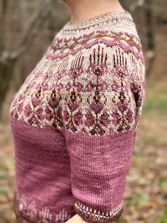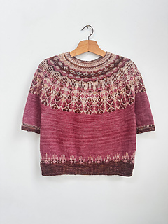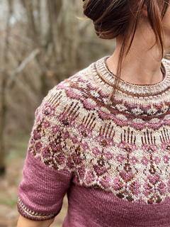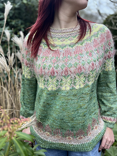 The yoke features alternating floral and geometric designs using the stranded knititing technique (3 threads per row)