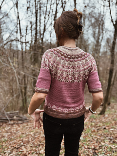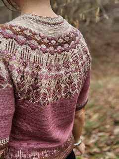 Alhambra It is an elegant yet versatile garment, embellished with refined 3-colour motifs made with the stranded technique and embellished with the beautiful melange shades of the hand-dyed yarn.