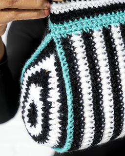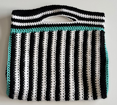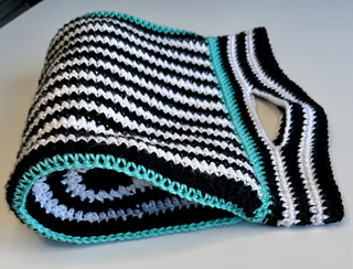 All the Stripes Bag was published in Simply Crochet, Issue 170. It is crocheted with Cygnet DK yarn in black and white with a pop of turqoise.
