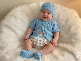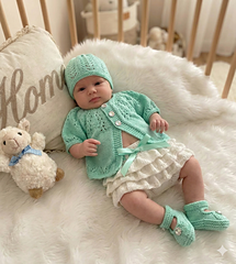 This charming four-piece knitting set features a delicate feather and fan lace design, creating a timeless and elegant look for a new arrival. The set includes a short-sleeved cardigan, a matching bonnet, ruffled nappy covers (bloomers), and sweet T-bar booties.