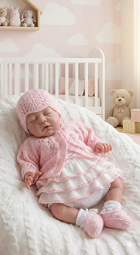 Design: Intricate eyelet lace detailing on the cardigan yoke, hem, and bonnet.