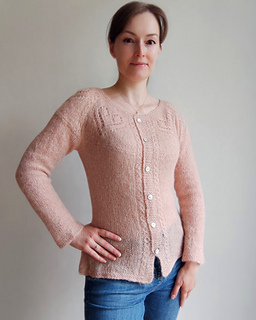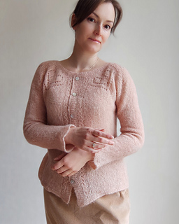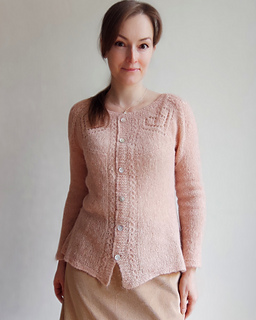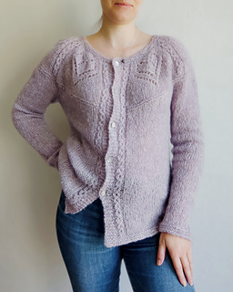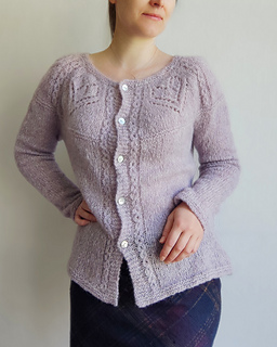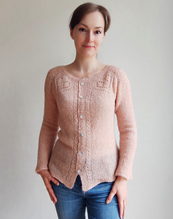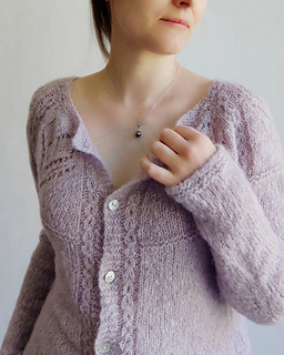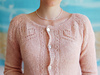The Angelique cardigan features round yoke with the lace pattern around the neck. The cardigan is worked back and forth top down on circular needles, with German short rows for back neck rise and with waist shaping at the sides of the garment. The sleeves are worked in the round.