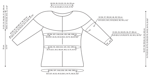 Sizes: 1 (2, 3, 4) (5, 6, 7, 8) with finished bust circumference 85 (94, 107, 116) (128, 139, 148, 158) cm / 33.5 (37, 42.25, 45.5) (50.5, 54.75, 58.25, 62)”. Intended to be worn 2 – 12 cm / 1 – 5” of positive ease. The bust circumference measured with the cardigan buttoned up. The sample is shown in size 2, with 5 cm / 2” ease.