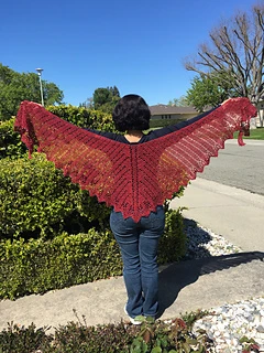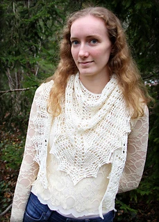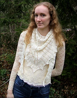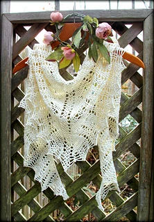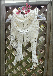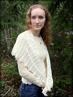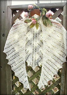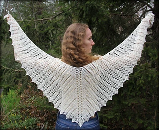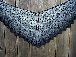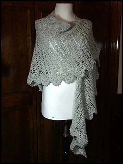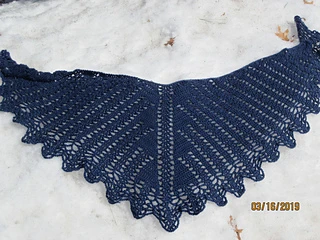 This shawl was designed for our 2019 CAL. It is a wide triangular shawl, starting at the back of the neck and widening outward as it is worked downward. The ratio of width to depth is approximately 3:1, and there is an option to add extra stitches to the starting chain to increase the width. There are two options for the lower border - a simple 3-row border, or a lacy 7-row border ripe with picots.
