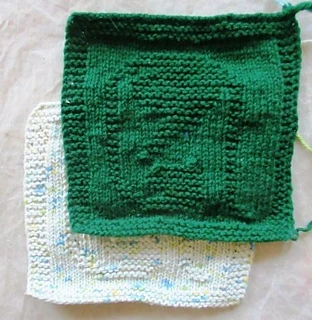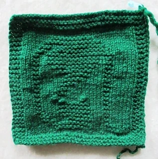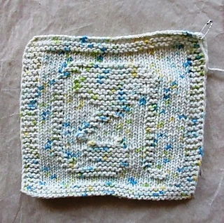 Another AlphaCAT Q is a piece of 7 1/2” x 7 1/2” / 19.1 cm x 19.1 cm in both cotton and acrylic square shaped afghan block. It uses knit and purl stitches and relief stitches to make up the cat and “Q” motif. It can also be used as coaster or dishcloth. It is written in one (1) colour and one (1) string.