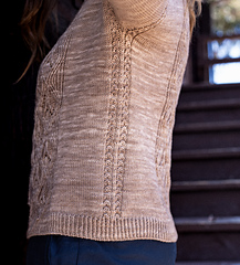 The Apato Pullover is a modern top-down sweater that blends clean Stockinette fabric with striking cable panels. The design features bold vertical motifs on the front, framed by simple lines that keep the look balanced and wearable.