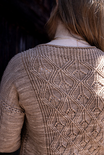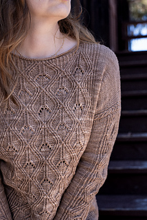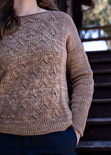 • This pullover is worked from the top down. The top back is worked back and forth to underarms, then stitches for front are picked up at the shoulders and worked back and forth to the underarm. The back and front then joined and the lower body is worked in the round to the lower edge.