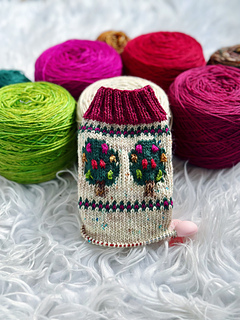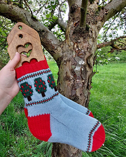 colorwork pattern borders the trees and is repeated just before the toe decreases. If you are not a fan of apples, you can even knit the bobbles with peach-colored yarn and make
