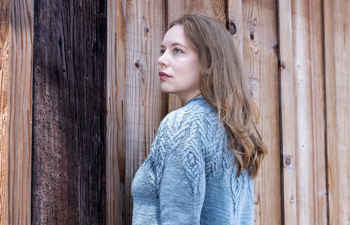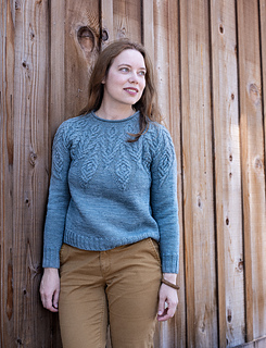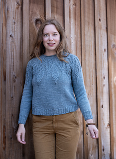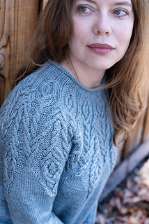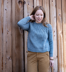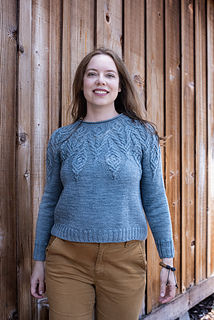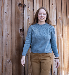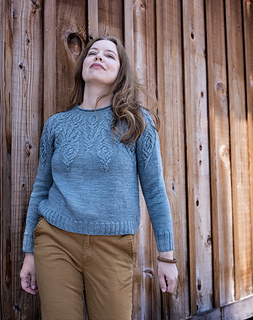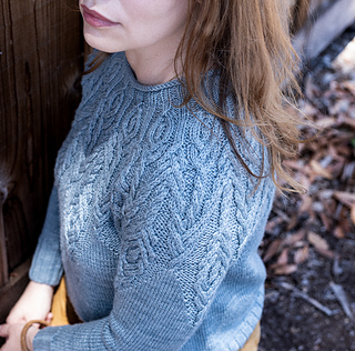 A round yoke of bold, interlocking cables makes this pullover stand out with sculptural detail. The motifs form diamond and chevron shapes that flow into the smooth stockinette of the body and sleeves, creating a striking contrast between texture and simplicity.
