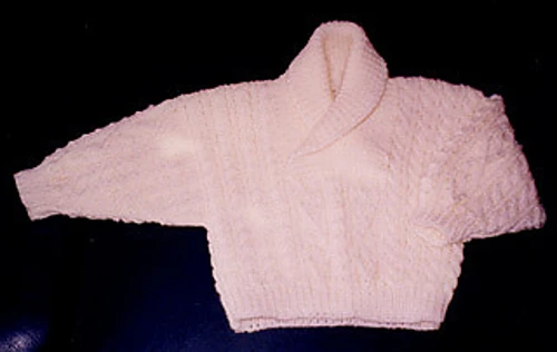 “A traditional aran design for baby in diamonds and cables, with a choice of necklines…shawl collar or shoulder buttoned crew neck.”