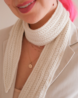 - Sample scarf: Nigh Fine from Purl Soho (100% cashmere; 448yds / 410m, 1.75oz / 50g) in color Heirloom White, held double. Note: this yarn is labeled as a light fingering weight but is actually a true lace weight, so holding it double achieved a fingering weight gauge