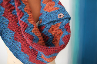 Arete is a colour-work cowl, crocheted in the round and then steeked (cut up the steek stitches). It can either be worn as a flat cowl with a twist, covering your shoulders and neck, doubled over on the inside to create a chunky neck cowl.
