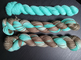 Yarn: The Blue Brick Dyeworks - Killarney Sock/ Sasquatch Sock Twins. 80% Superwash Merino Wool, 25% Nylon. 2 x 200 yard skeins and 1 x 30 g contrast skein. “Caribbean Christmas” colourway.