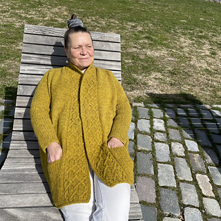 Yarn: Jalovilla Uuhi, 100% wool from Finnish sheep breeds, (100g = 230m), colourway Kesä 3697, 7 (7, 8, 8, 9) (10, 10, 11, 11) skeins. Total of 1690 (1800, 1890, 2020, 2200) (2450, 2530, 2720, 2830) yds / 1550 (1650, 1730, 1840, 2010) (2240, 2310, 2490, 2580) m. You can use any yarn, but this will affect your gauge and the amount of yarn needed.