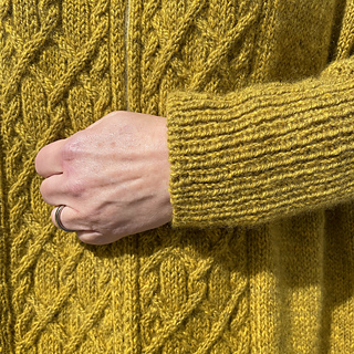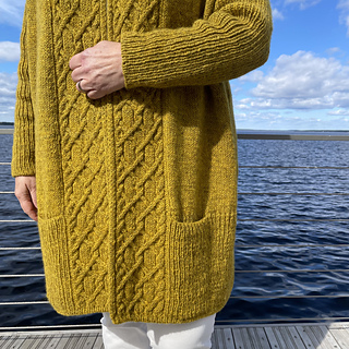 Arvo is worked top down in one piece starting from the center back of the shawl collar. The cables of the collar continue all the way to the hem. The stitches of the body are increased with raglan increases and some width is added to the collar at the same time. The sleeves are snug and worked in 1/1 ribbing. The body is straight and worked in stockinette. The hem has a high ribbing which hides two pockets. They will fit your phone or a ball of yarn. The hem and cuffs are finished with a sewn bind off which gives the cardigan a sophisticated look.
