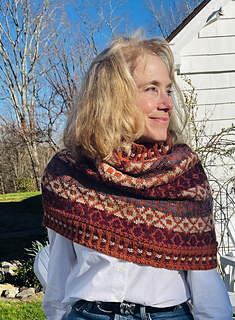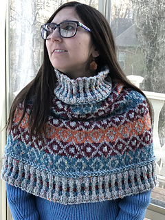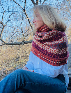 Aspetuck is a cowl worked in the round from the lower edge to the neckline. The stranded colorwork uses four colors of worsted weight yarn to highlight the diamond motifs that are repeated for a balanced design, and Latvian Braids for added texture. Aspetuck is recommended to be worn with positive ease of 2 to 10” / 5 to 25 cm.