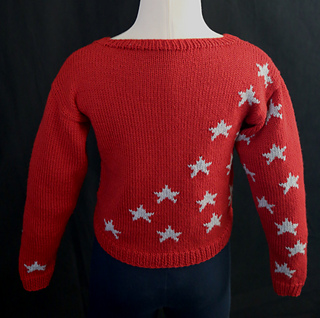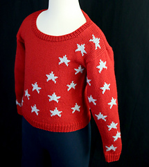 This simple sweater features intarsia stars across one side of the front and back and on the sleeve, which changes the project level to Intermediate. The sweater is sized from newborn to 10 years, with separate charts for the smaller and larger sizes. The star pattern begins with several stars at the right bottom of the front and ends with a single star at the left shoulder. There are stars on the left edge of the sleeve. The pattern is reversed on the back.