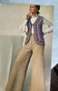 Embroidered vest tops wide-flaring pants, for at-home elegance. Pants, worked in single and double crochet, are lined. The single crochet vest is embroidered with chained feather stitch, straight stitch, French knots, couching, lazy daisy stitch, and cable stitch.