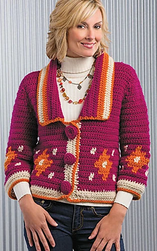 • Brown Sheep Lamb’s Pride Bulky bulky (chunky) weight wool/mohair yarn (4 oz/125 yds/113g per skein): 8 (8, 9, 9, 10) skeins #M23 fuchsia 2 (2, 3, 3, 3) skeins #M22 autumn harvest 2 skeins #M140 Aran
