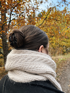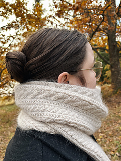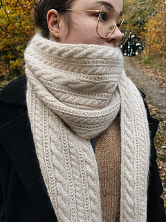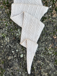 The Aune shawl is worked flat in one piece from tip to tip with a cable pattern and i-cord edges.