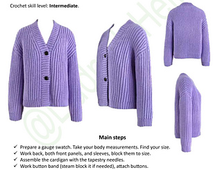 • Prepare a gauge swatch. Take your body measurements. Find your size. Deside if you need to alter the length.