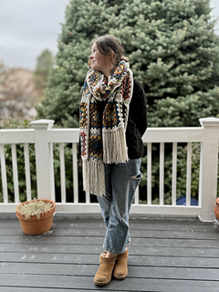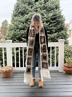 If you love the fall vibe of the scarf as pictured, the pattern gives yarn colors and amounts needed, and the granny squares are mapped out by color combinations and number of each combination needed to make the scarf exactly as shown.