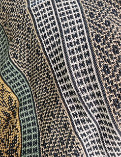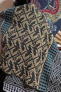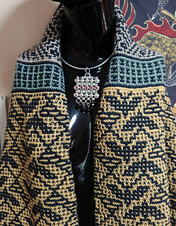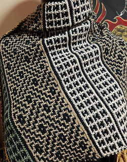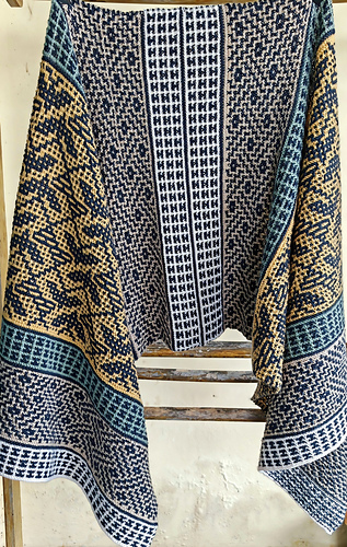 Mexico has always had an influence on my design work – dating from my first visits in the 1970s. The impact of the Aztecs on Mexican culture has been significant – including in its art and traditions. Some of the elements in the three mosaic designs used in this pattern reflect that influence. As the shawl is worked in garter stitch, I would consider it a good introduction to colorwork knitting for advanced beginners.