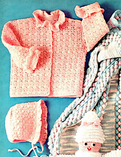 Pink baby bonnet. Matching cardigan with ruffle cuffs.