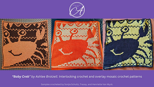 Samples crocheted by Altona Newcombe, Angela Kermack, CynCityCrochets, Henriette Van Wyck, Steffi, and Tracey.