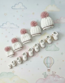 The pattern provides the instructions to make the bobble hat and little shoes in 6 sizes Premature, Newborn, 3 Months, 6 Months, 9 Months, and 12 Months.