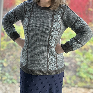 The hem ribbing is worked first, then the stranded colourwork is worked in the round from hem to underarm and worked flat from underarm to shoulders. The shoulders are joined with a 3-needle bind-off. The neckband is picked up and worked in the round, then sleeve stitches are picked up and the sleeves are worked down to the cuffs.