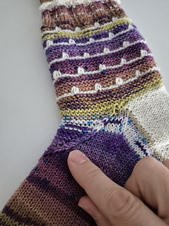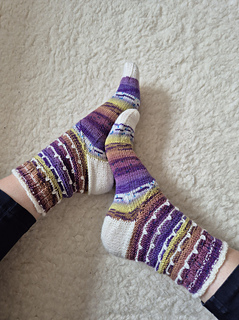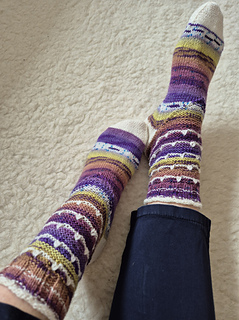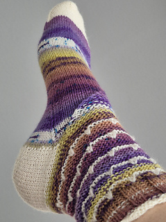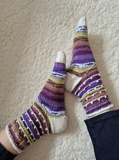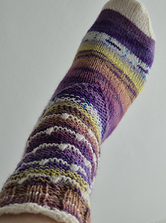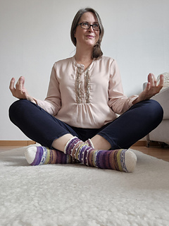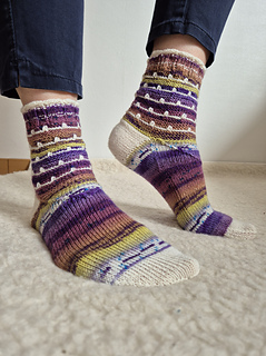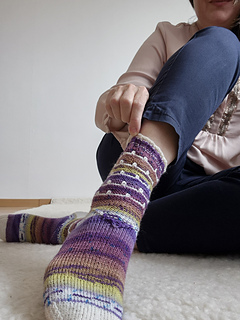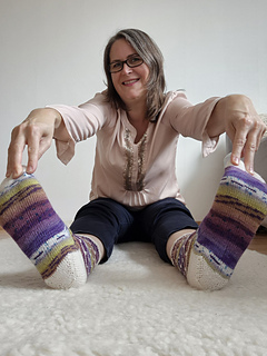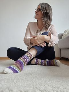The socks are knitted from the cuff down with a heel flap and gusset. The instructions offer both knitting techniques: on circular needles (Magic Loop) or with classic double-pointed needles.