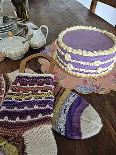 „“Birthday Cake” is appropriately named the colour of the gradient yarn from Lang Yarns. Using a solid white as “frosting”, wonderful birthday socks can be knitted from it.
