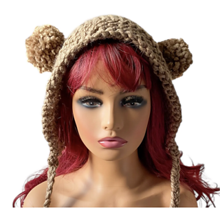 This is a super chunky knit hat, a bonnet style with pompoms on the sides to give cute bear ears.