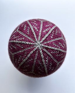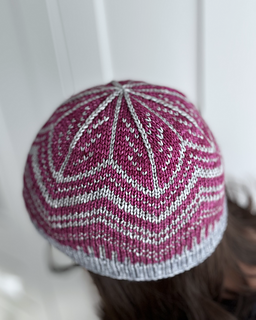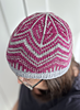 Bella Viola is a stranded colourwork hat knit from the bottom up with the pattern flowing from the ribbed brim up to the pretty crown.