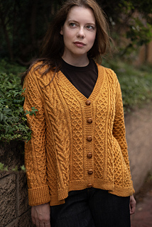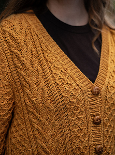 Worked flat with a classic button band, deep ribbing at the hem and cuffs, and a relaxed fit, this piece layers effortlessly over shirts or dresses. Thoughtful shaping ensures a flattering line, while the bold stitchwork makes the cardigan a true showcase of cable artistry.